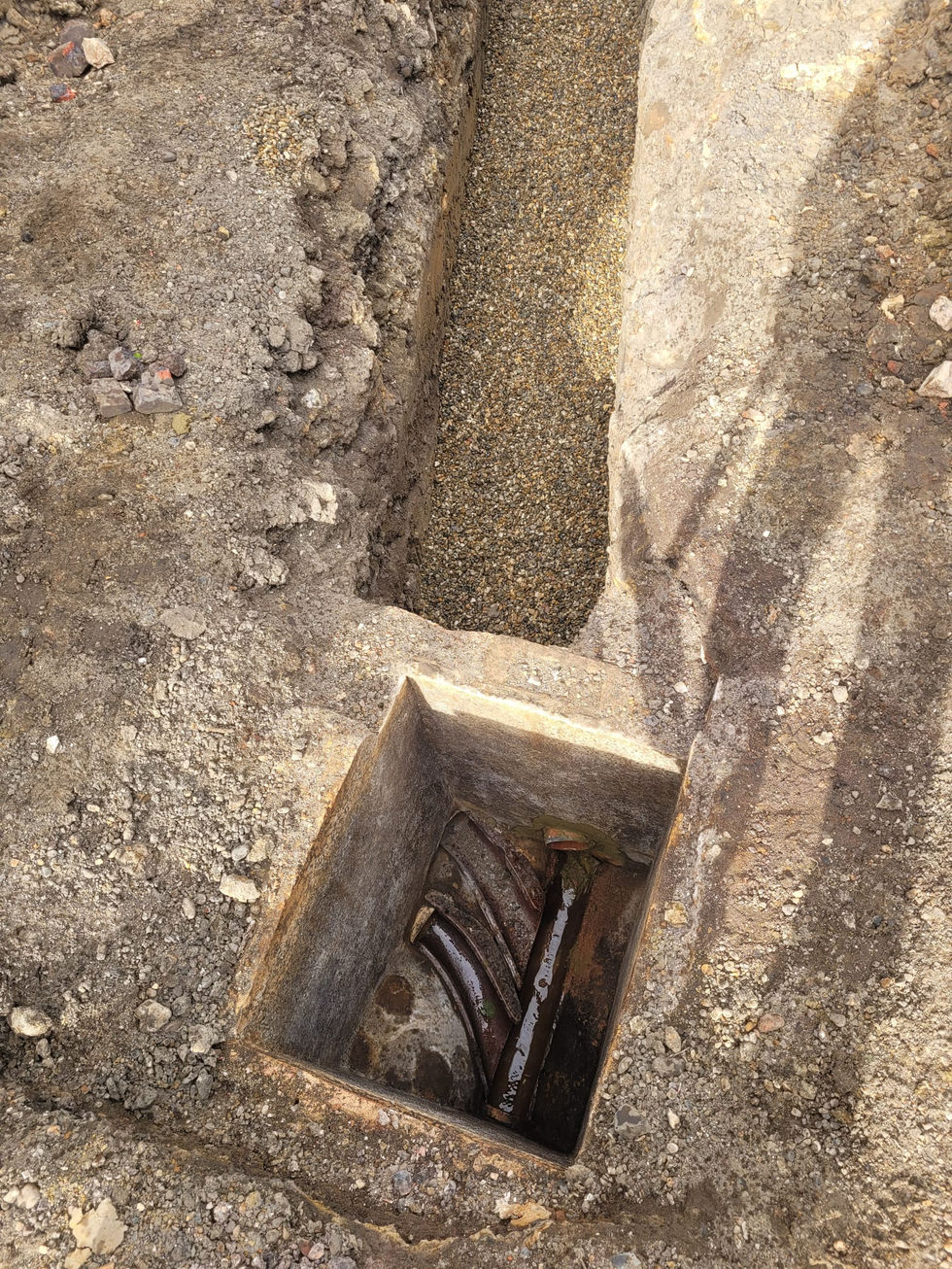 This project showcases the various stages of a construction site, from excavation to foundation building and brickwork. It includes images of trenches, concrete foundations, scaffolding, and equipment.